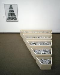 The Non-sites were presented as simple containers of painted or galvanised steel that contained the raw material, such as rocks, gravel and salt, collected from distant sites. Next to this collection of raw material, maps were shown indicating the mines, excavations or quarries from which the materials had been taken. The maps were crucial as they directed the viewer to the original site and established the ‘dialectic’ between site and non-site. Smithson noted in his own comparison that a site is about scattered information (‘The site is a place you can visit and it involves travel as an aspect too’) and a non-site is about contained information.